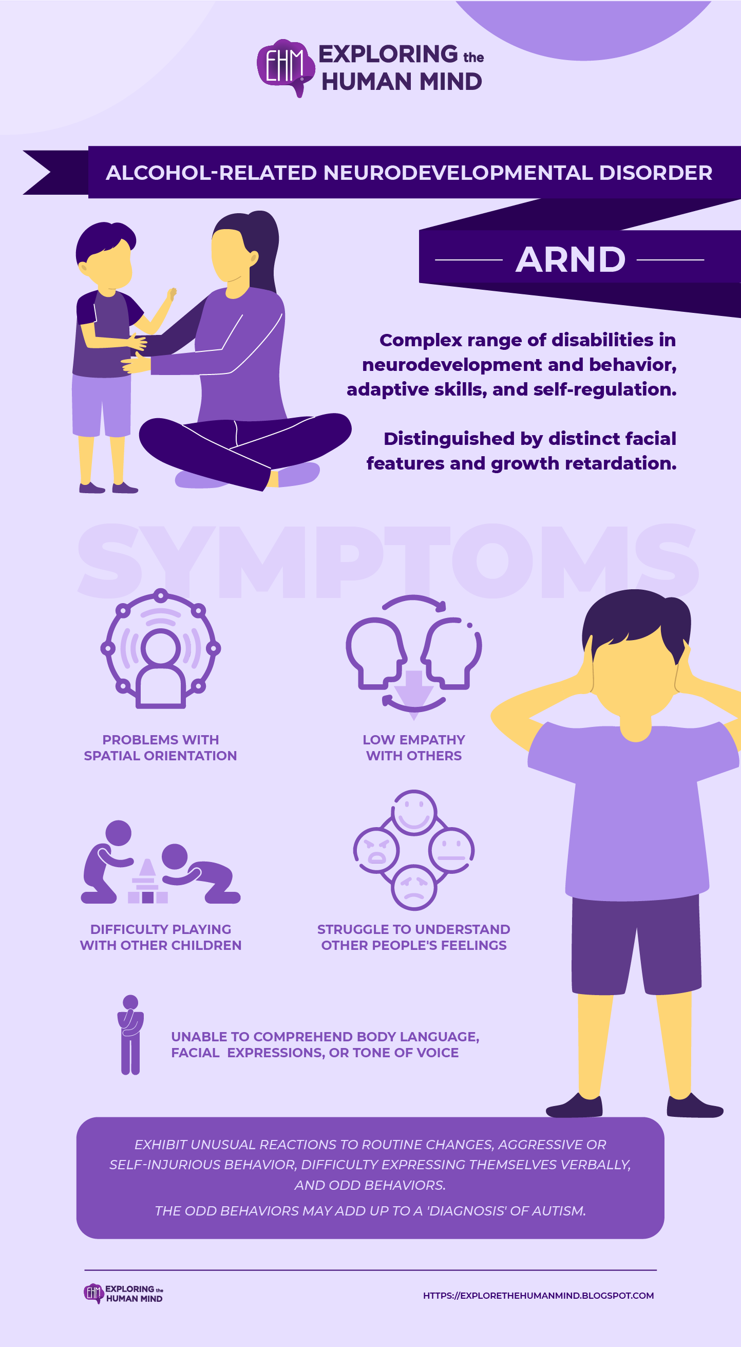 They also exhibit unusual reactions to routine changes, aggressive or self-injurious behavior, difficulty expressing themselves verbally, and odd behaviors. The odd behaviors in ARND may add up to a 'diagnosis' of autism.