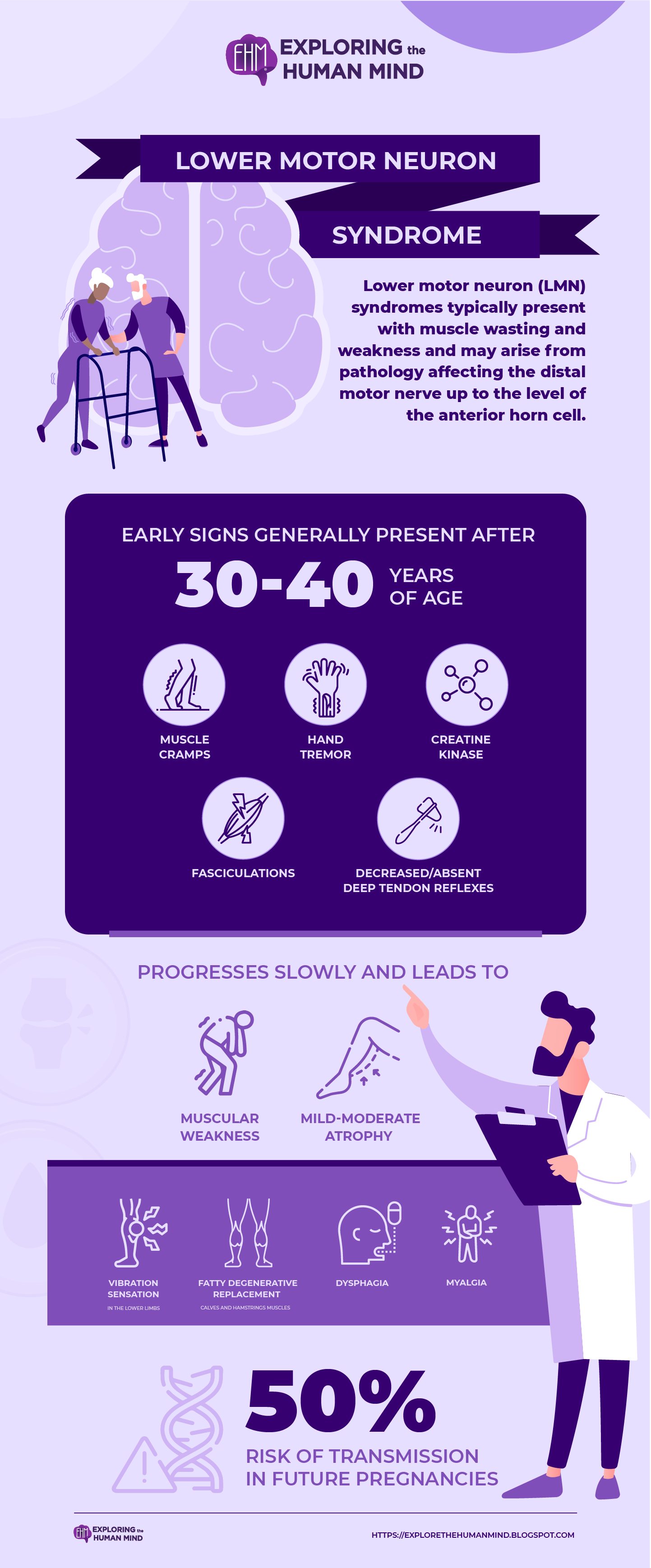 Genetically causes include spinal muscular atrophy, distal hereditary motor neuropathy, and LMN variants of familial motor neuron disease. A number of disease-causing mutations have been discovered as a result of recent genetic advances. Immune-mediated disorders, such as multifocal motor neuropathy and chronic inflammatory demyelinating polyneuropathy, account for a subset of LMN presentations and should be recognized because effective treatments exist. The current review will outline the spectrum of adult-onset LMN syndromes and provide a framework for clinicians evaluating a patient with primarily LMN features.The disease is inherited in an autosomal dominant manner. Affected families should receive genetic counseling, which should inform them of the 50% chance of transmission in future pregnancies.