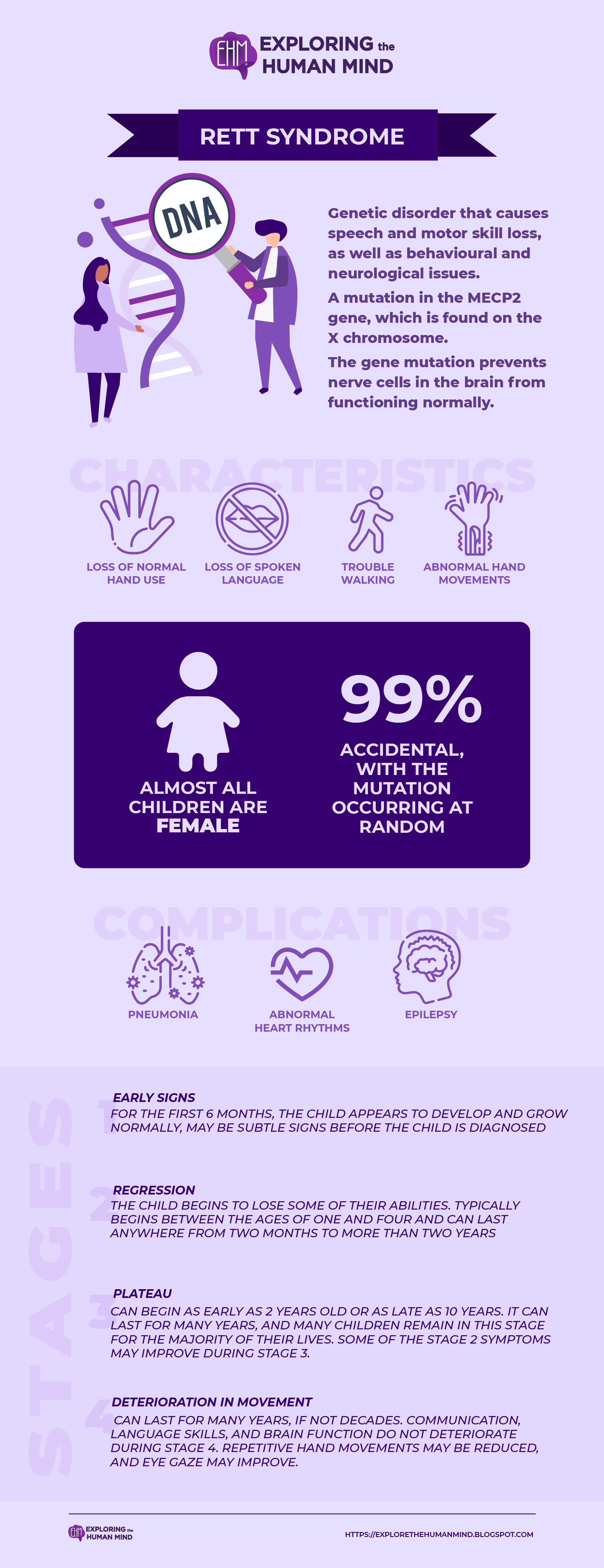 Rett syndrome is divided into four stages, though symptoms frequently overlap. The following are the main characteristics of each stage: