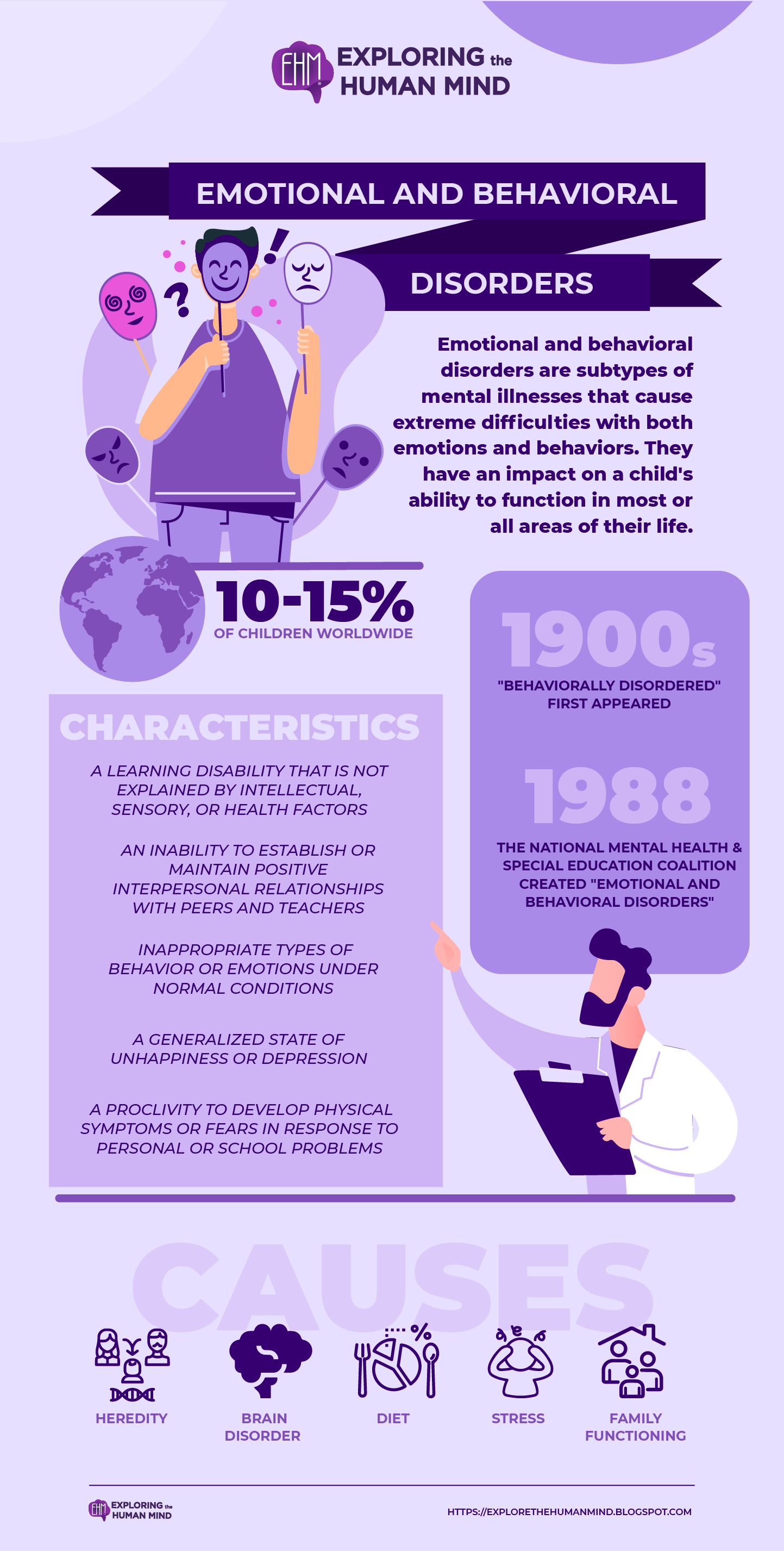 What Are Emotional and Behavioral Disorders? | HealthyPlace. (2022). Healthyplace.com. https://www.healthyplace.com/parenting/behavior-disorders/what-are-emotional-and-behavioral-disorders#:~:text=Emotional%20and%20Behavioral%20Disorders%20Definition&text=A%20pattern%20of%20disruptive%20behaviors,situations%2C%20and%20in%20other%20settings