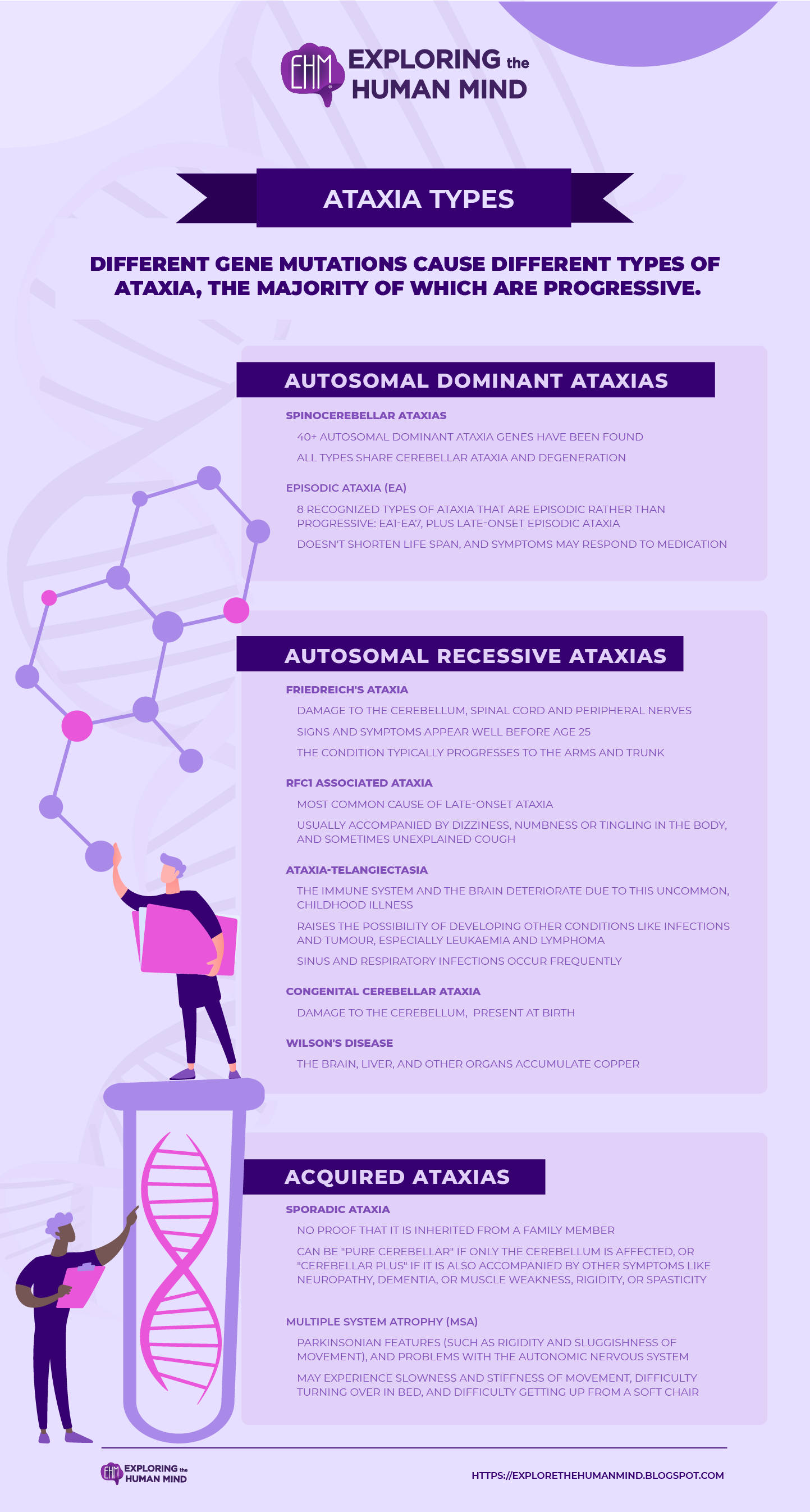 Different gene mutations cause different types of ataxia, the majority of which are progressive. Each type causes poor coordination, but each has distinct signs and symptoms.